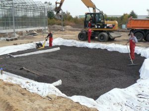 Einbau des Brauchwasserspeichers mit Überlauf in eine Rigole