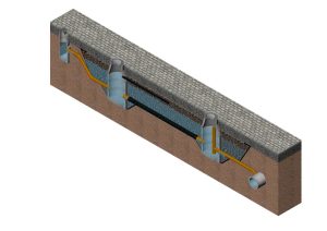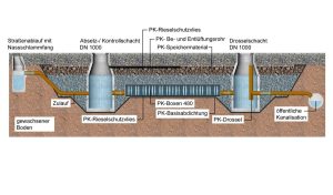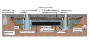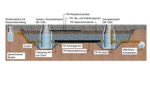 Über Kunststoffgitterboxen wird das Niederschlagswasser an das tragfähige PK-Speichermaterial abgegeben und zwischengespeichert. Von dort wird es gedrosselt an einen Sammler, Vorfluter oder eine Versickerungsmulde abgeleitet.